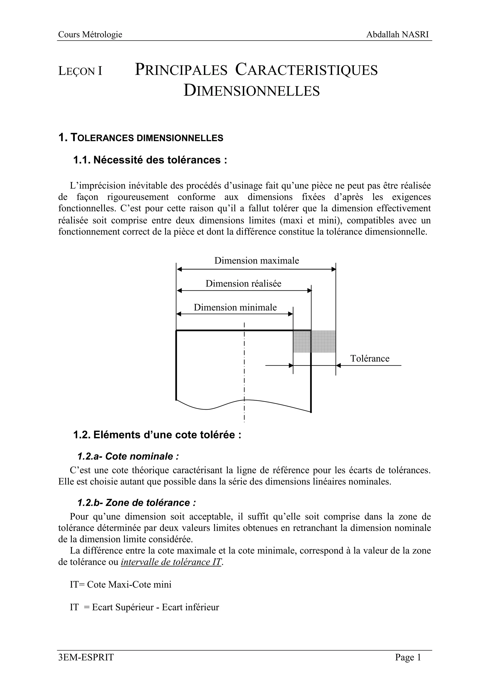 Le document traite des caractéristiques dimensionnelles et de la tolérance en métrologie, précisant la nécessité de tolérances pour compenser l'imprécision des procédés d'usinage. Il aborde également la normalisation des tolérances selon des classes et leur application dans les ajustements entre pièces mécaniques, tout en décrivant les qualités d'instruments de mesure. Enfin, il présente les types de mesures dimensionnelles, notamment la mesure directe et les instruments associés.