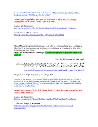 Le document évoque les actes de torture ordonnés par Mahomet, le prophète de l'islam, lors de différents événements, notamment lors de la prise de Khaybar et l'interrogation d'ennemis capturés. Il décrit également l'application de châtiments corporels extrêmes, ainsi que des versets coraniques sanctionnant des peines similaires. Globalement, le texte remet en question l'image de miséricorde souvent associée à Mahomet, en mettant en avant des épisodes de violence et de brutalité.