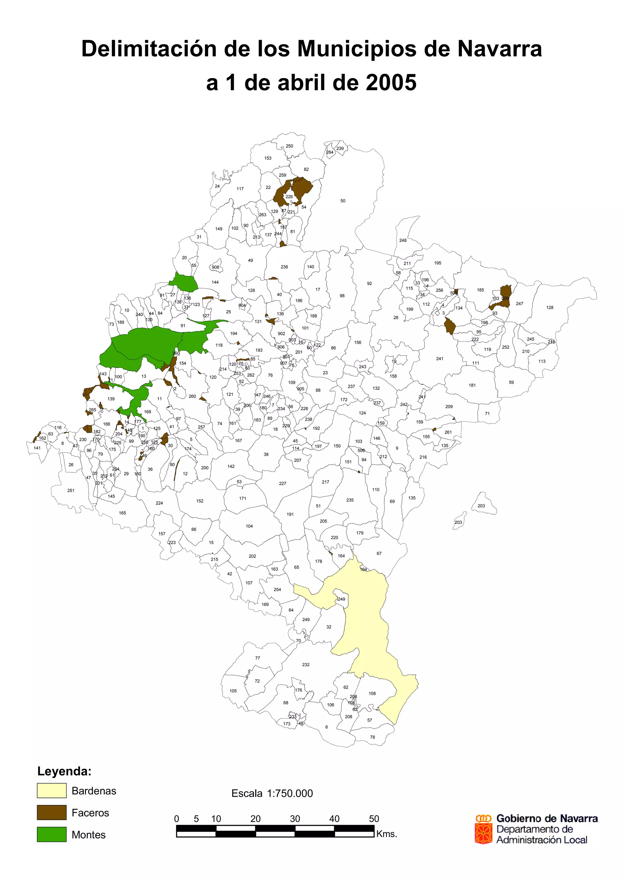 Le document présente la délimitation des municipalités de Navarre à partir du 1er avril 2005, en fournissant une liste de chiffres et de codes associés aux différents territoires. Il inclut également une légende pour la carte, indiquant une échelle de 1:750.000 et des informations sur les facéros. Ce document est utile pour comprendre la structure administrative de Navarre.