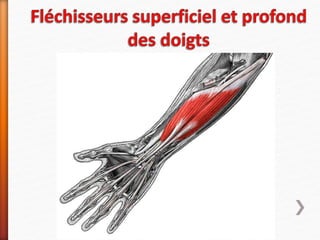 Le document décrit la structure et les fonctions des muscles de l'avant-bras, répartis en trois loges musculaires : antérieure, postérieure et latérale. Chaque loge contient des muscles spécifiques avec des rôles bien définis, innervés par les nerfs médian, ulnaire et radial. Les muscles antérieurs sont principalement fléchisseurs, les postérieurs sont extenseurs et les latéraux impliquent des mouvements de supination.