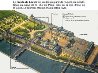 Le musée du Louvre, situé à Paris, est l'un des plus grands musées du monde, présentant 35 000 œuvres d'art dans un ancien palais royal réaménagé. Il comprend huit départements, tels que les antiquités égyptiennes et grecques, ainsi que des peintures emblématiques comme la Mona Lisa de Léonard de Vinci. Le musée a été transformé sous la direction de l'architecte Ieoh Ming Pei, avec une pyramide de verre à l'entrée.