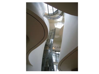 Le musée Guggenheim de Bilbao, conçu par Frank O'Gehry et ouvert en 1997, est une œuvre architecturale futuriste qui combine pierre, verre et titane, reflétant des lumières naturelles et artificielles. Son intérieur spectaculaire comprend un hall de près de 50 m de hauteur et 19 salles d'exposition, créant une harmonie entre l'architecture et les œuvres d'art présentées. Bien que largement salué pour son innovation, le musée suscite également des critiques concernant son impact visuel concurrentiel avec les œuvres qu'il abrite.