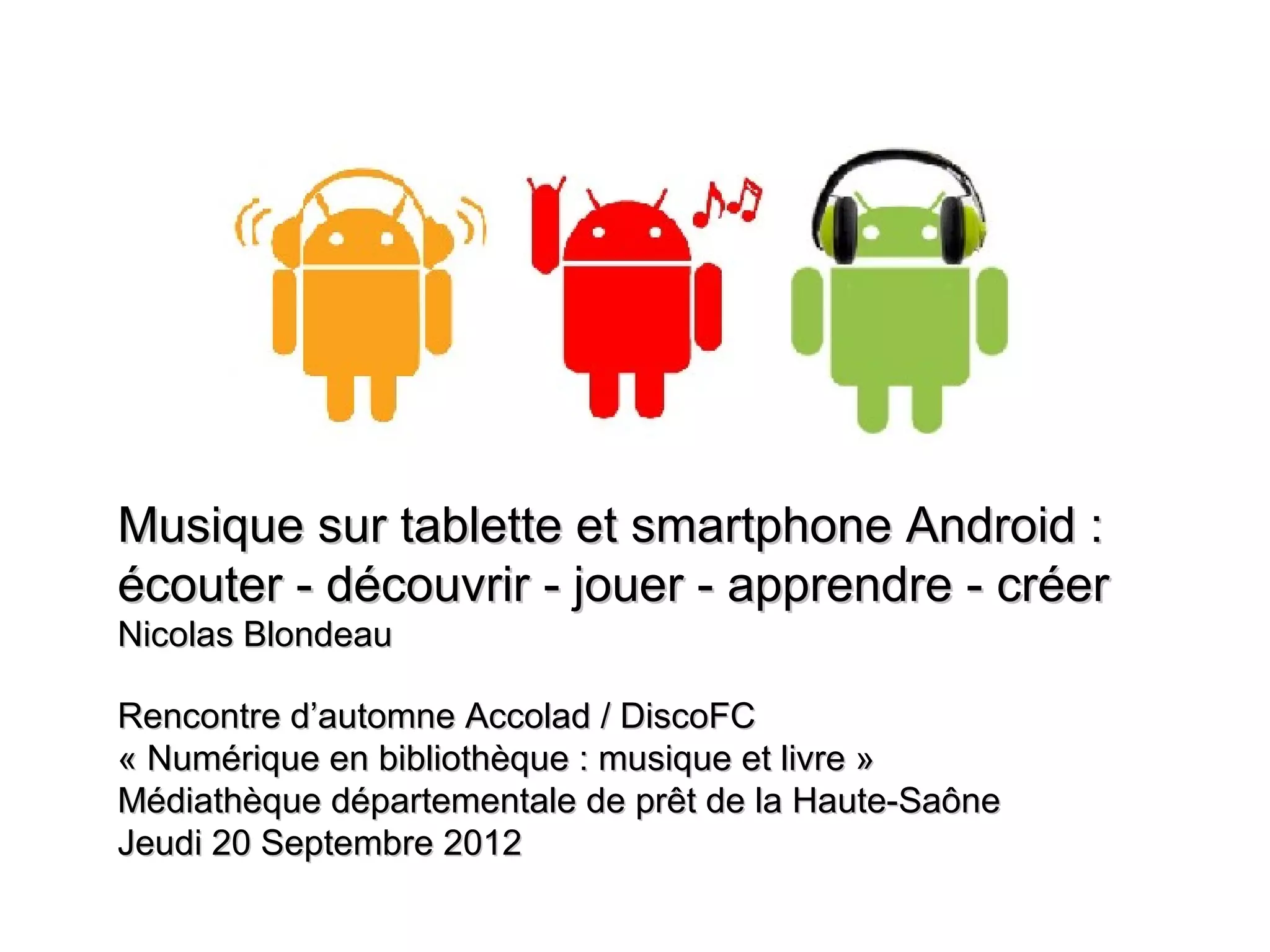 Le document traite des applications musicales disponibles sur les tablettes et smartphones Android, abordant les outils pour écouter, créer et apprendre la musique. Il compare la part de marché d'Android et d'iOS, ainsi que les différentes applications pour le streaming audio et vidéo, la gestion des podcasts et l'apprentissage musical. Les avantages et inconvénients d'Android par rapport à iOS sont aussi discutés, notamment en ce qui concerne l'accessibilité et la qualité des applications.