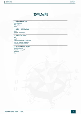 Le rapport d'Inforisk sur la société Mutandis révèle un capital social de 680 millions de dirhams et un chiffre d'affaires de près de 48,8 millions de dirhams en 2017, avec un résultat net de 18,76 millions de dirhams. Cependant, la société présente un score de risque de défaillance très fort de 29 sur 100, témoignant d'une performance faible et d'une capacité d'autofinancement négative. Le document fournit également des détails sur la structure du capital et les dirigeants de l'entreprise.