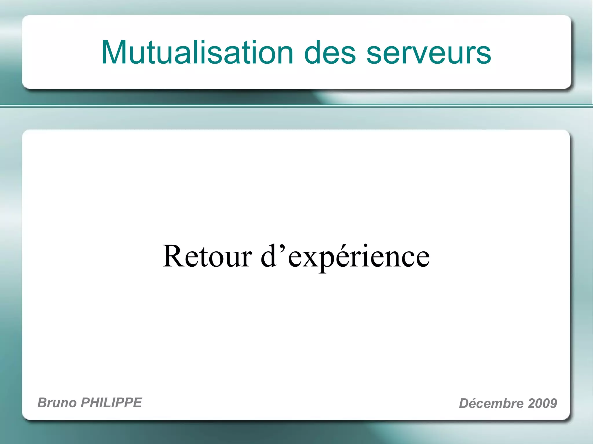 Le document présente une étude de mutualisation des serveurs visant à optimiser les coûts d'infrastructure et d'administration grâce à la virtualisation et à des solutions techniques adaptées. Une analyse approfondie des besoins, des architectures et des coûts a été réalisée, mettant en avant des gains significatifs sur les ressources et une amélioration de la disponibilité des applications. La conclusion souligne la viabilité du projet et les bénéfices d'une administration simplifiée pour plusieurs équipes.