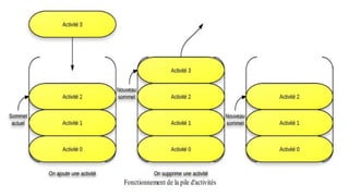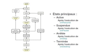 Le document présente les concepts fondamentaux de la programmation Android, y compris les composants essentiels tels que les intents, les views, les activities, les services, les content providers et les broadcast receivers. Il décrit également le cycle de vie d'une activity, soulignant l'importance de l'interaction avec le système et d'autres applications. Enfin, le document aborde la gestion des états d'une activity dans une pile d'activités.