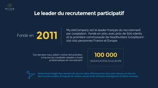 Everyone is a Headhunter, fondé en 2011 par MyJobCompany, est le leader français du recrutement par cooptation, avec une communauté de 100 000 headhunters en Europe. La plateforme utilise des technologies avancées pour aider ses clients à trouver des candidats qualifiés plus rapidement, en proposant des solutions de recrutement flexibles et basées sur le succès. Leur approche permet de réaliser des recrutements en 12 jours en moyenne, contre 32 jours pour les méthodes traditionnelles.