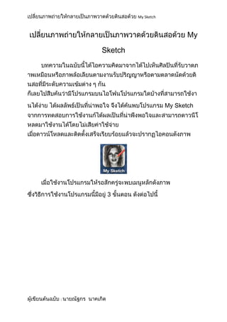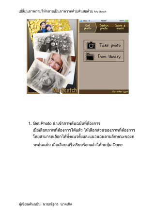 The document outlines steps for creating a sketch from a photograph, including taking the photo, sketching it, finalizing the sketch, and saving and sharing the final image.