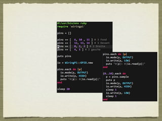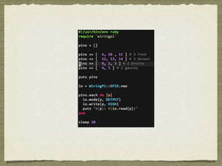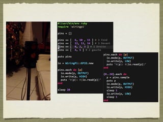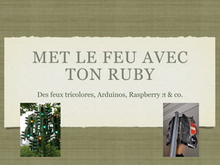 Le document présente un projet utilisant Ruby, Arduino et Raspberry Pi pour contrôler des feux tricolores. Il fournit des liens vers des ressources et du code open source, ainsi que des conseils pour l'industrialisation de la solution. La discussion inclut également des considérations sur l'achat de matériel et l'utilisation de l'Ethernet ou du Wi-Fi pour la connectivité.