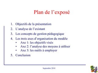 Le document présente une analyse et une proposition d'un nouveau modèle de formation professionnelle pour les techniciens spécialisés. Il souligne l'importance de l'approche par compétences, de l'engagement des formateurs, et d'une pédagogie centrée sur l'apprenant. Les axes d'organisation incluent la définition d'objectifs clairs, l'analyse des moyens pédagogiques à utiliser, et l'application d'outils adaptés pour améliorer l'efficacité de l'apprentissage.