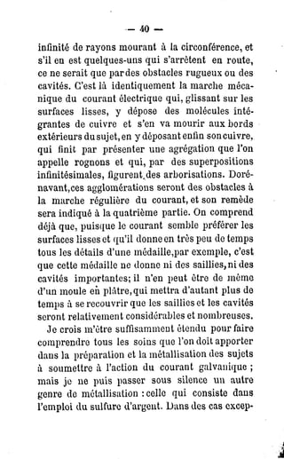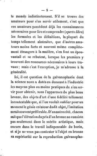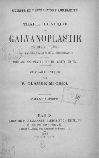 Le document est un traité pratique sur la galvanoplastie, détaillant des leçons sur le moulage et la métallisation des objets. Il précise également les conditions de réutilisation des contenus disponibles sur Gallica, y compris les distinctions entre réutilisation commerciale et non commerciale. Enfin, il met en avant la nécessité de respecter la législation en vigueur concernant la propriété intellectuelle.