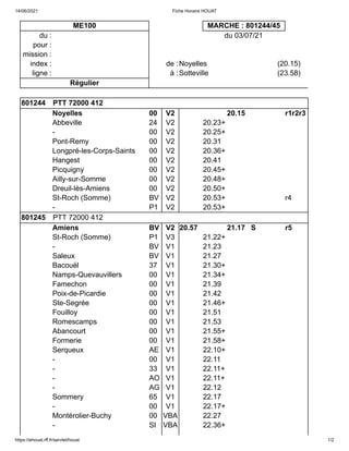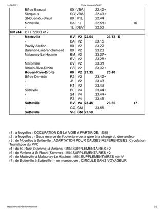 Le document fournit l'horaire détaillé d'une ligne de train reliant plusieurs stations, allant de Noyelles à Sotteville, avec des arrêts spécifiques et les heures de départ. Il mentionne également des conditions particulières pour certaines sections, telles que des temps supplémentaires ou des restrictions en raison de l'occupation de la voie. Les informations comprennent des détails sur les trains de passagers et les ajustements de circulation touristique.