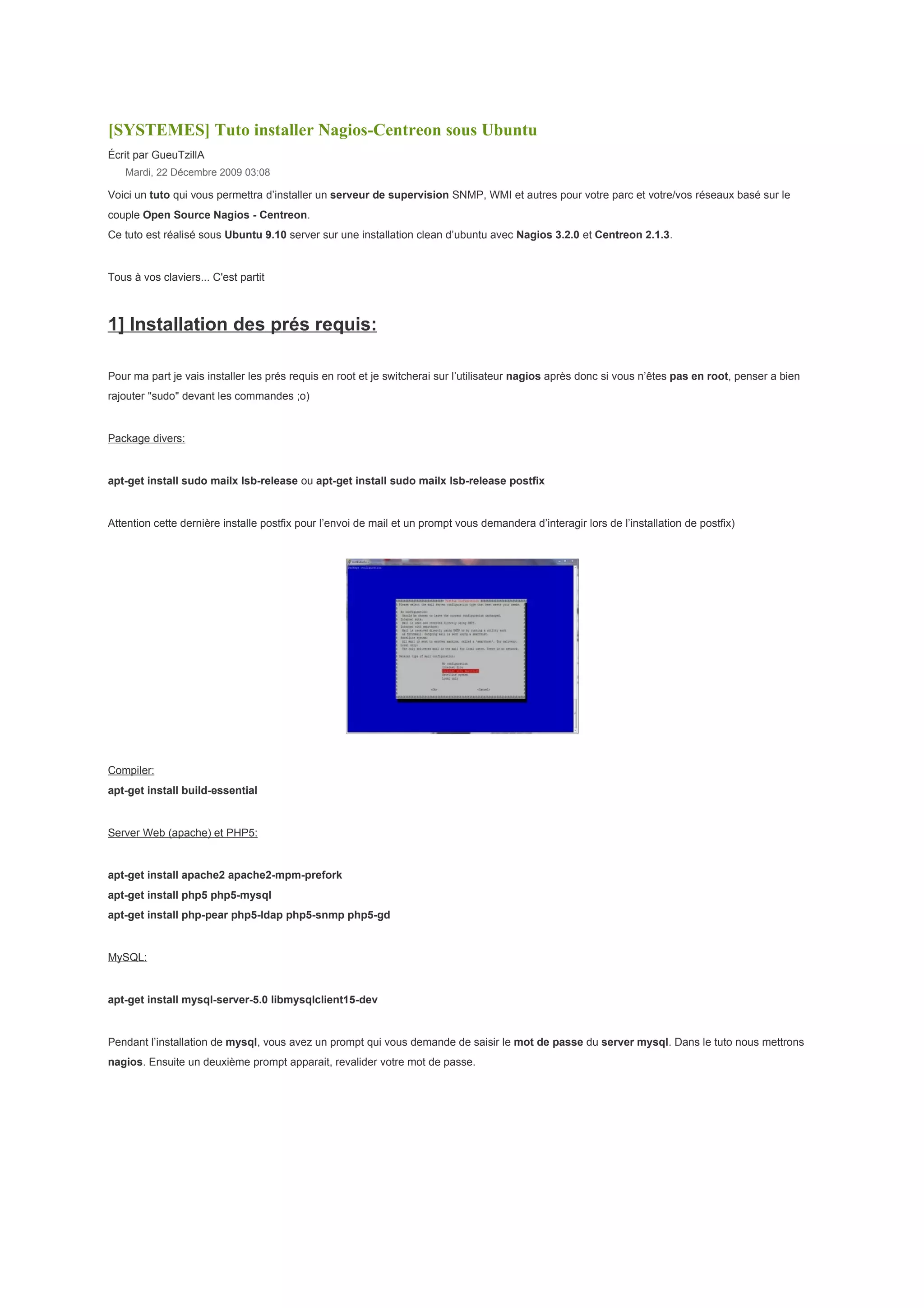 Ce document fournit un tutoriel détaillé pour installer Nagios et Centreon sur un serveur Ubuntu 9.10. Il décrit les prérequis, la création d'un utilisateur dédié, et les étapes d'installation de Nagios, de ses plugins, ainsi que de Centreon, y compris la configuration du serveur web Apache et de la base de données MySQL. Le tutoriel conclut avec des instructions pour finaliser l'installation via une interface web.