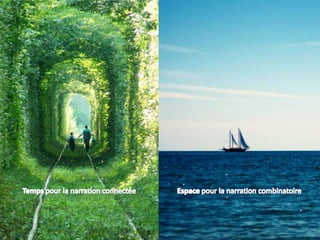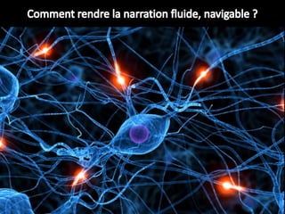 Le document explore la narration combinatoire et le responsive storytelling, mettant en avant une approche dynamique et interactive de la narration qui évolue selon l'interaction entre créateur et récepteur. Il présente des concepts tels que le découplage des contenus, l'utilisation de métadonnées et l'importance de la participation active du spectateur. En soulignant les défis contemporains de la narration à l'ère numérique, il appelle à repenser les structures narratives pour s'adapter à un monde en constante évolution où chaque utilisateur peut devenir co-auteur.