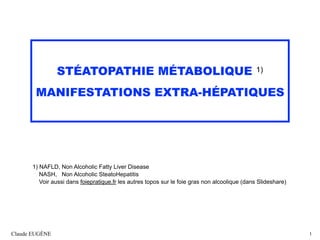 La stéatopathie métabolique, comprenant la NAFLD et la NASH, est une maladie hépatique fréquente associée à des complications graves comme le diabète de type 2, les maladies cardiovasculaires et divers cancers. La prévalence de la NAFLD est en forte augmentation parallèlement à l'épidémie d'obésité, et le risque hépatique et extra-hépatique est accru surtout en cas de fibrose. Des liens existent entre cette pathologie et d'autres troubles comme les apnées du sommeil, ainsi que des manifestations extra-hépatiques telles que l'ostéoporose et la maladie rénale chronique.