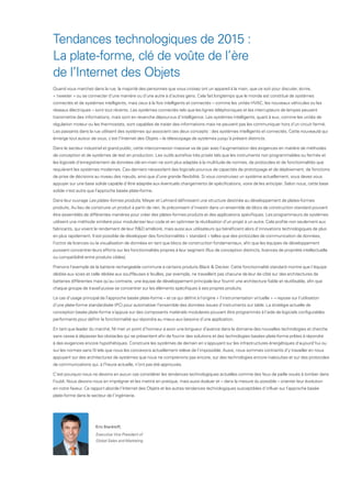 Le document analyse les tendances technologiques de 2015, mettant en avant l'importance croissante des systèmes connectés et intelligents, notamment à travers l'internet des objets. Il souligne que les approches basées sur des plateformes standardisées permettront une meilleure modularité et réutilisation dans le développement, améliorant ainsi l'efficacité des processus de R&D. L'émergence de la 5G représente également un tournant, ciblant une interconnexion massive et des débits de données exponentiels tout en posant des défis en termes de conception et de développement de réseaux.