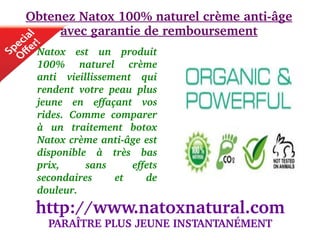 Natox est une crème anti-âge 100% naturelle conçue pour réduire l'apparence des rides sans les effets secondaires associés au botox. Offrant une garantie de remboursement de 60 jours, elle pénètre profondément dans la peau pour relaxer les muscles et améliorer l'hydratation tout en étant hypoallergénique. Disponible à un prix abordable, elle est présentée comme une alternative indolore et sans produits chimiques nocifs pour le soin de la peau.