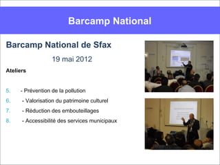 Le Barcamp national de Sfax, tenu le 19 mai 2012, a réuni des ateliers sur la prévention de la pollution, la réduction des embouteillages, la valorisation du patrimoine culturel et l'accessibilité des services municipaux. Les propositions incluent la diffusion d'informations en temps réel sur la pollution et la circulation, ainsi que la création de portails et d'applications pour promouvoir le patrimoine culturel et améliorer l'accès aux services locaux. Ces initiatives visent à sensibiliser la population et à améliorer la qualité de vie dans la ville de Sfax.