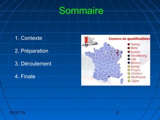 Le document détaille le processus d'une compétition étudiante créée en 1989, comprenant des étapes de préparation, de qualification et de finale. Les étudiants se préparent en 20 minutes sur un sujet donné avant de présenter devant un jury. La finale implique deux finalistes, un jury et des spectateurs, menant à un verdict.