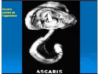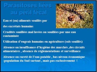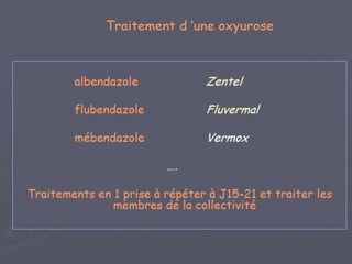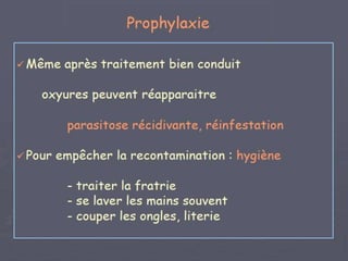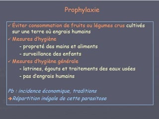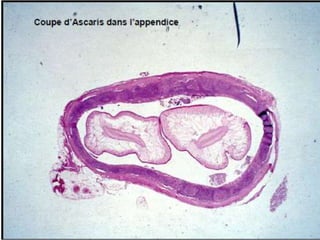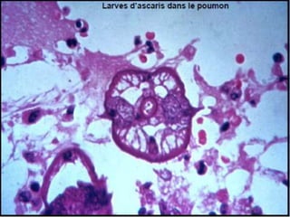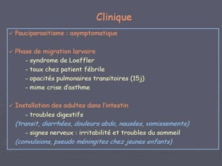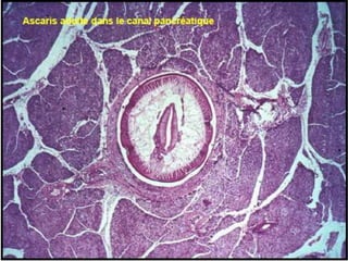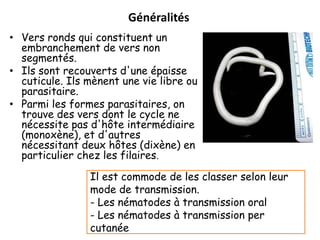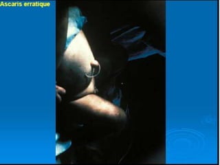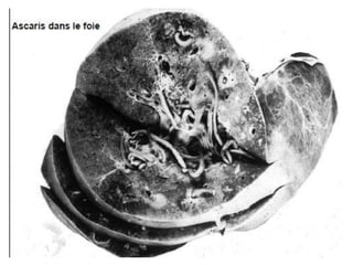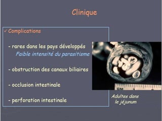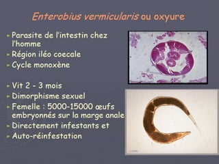 Le document présente des généralités sur les nématodes, notamment leur classification en fonction de leur mode de transmission et décrit plusieurs parasitoses intestinale causées par des nématodes, telles que l'oxyurose, l'ascaridiose, la trichocéphalose, la trichinellose et la dracunculose. Chaque parasitose est accompagnée d'informations sur l'agent pathogène, le cycle de vie, la clinique, le diagnostic et le traitement. La dracunculose, par exemple, est une affection tropicale en déclin grâce aux efforts d'éradication, tandis que la trichinellose est généralement contractée par la consommation de viande contaminée.
