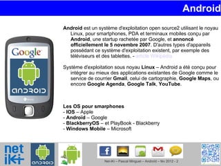 Android est un système d'exploitation open source basé sur le noyau Linux, principalement conçu pour les smartphones et d'autres appareils mobiles. Il facilite l'intégration des applications Google et dispose d'une vaste boutique d'applications avec plus de 200 000 disponibles en 2012. Le protocole SIP est également mentionné, permettant des communications via internet, notamment pour la téléphonie par VoIP.