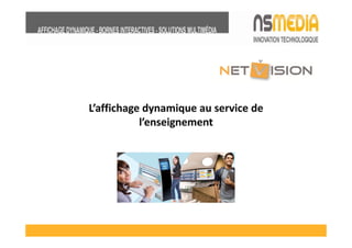 Netvision est une société d'ingénierie spécialisée dans les technologies de l'information, offrant des solutions d'affichage dynamique pour les établissements. Cette solution permet une diffusion d’informations en temps réel, améliore la communication interne et attire l'attention des étudiants bien davantage que l'affichage statique. La proposition inclut l’installation d’écrans HD et d’un système de gestion des contenus, avec une période d’essai gratuite jusqu’au 20 juin.