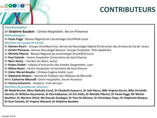 Le document présente un référentiel sur les neuropathies périphériques associées au cancer, mettant en avant les neuropathies dues aux atteintes locorégionales, aux traitements (iatrogènes) et aux facteurs métaboliques. Il souligne la prévalence élevée des douleurs neuropathiques chez les patients cancéreux, notamment après chimiothérapie et chirurgie, ainsi que l'importance d'une détection précoce pour améliorer la qualité de vie. Enfin, il offre des pistes de prévention et des approches thérapeutiques pour gérer ces neuropathies.