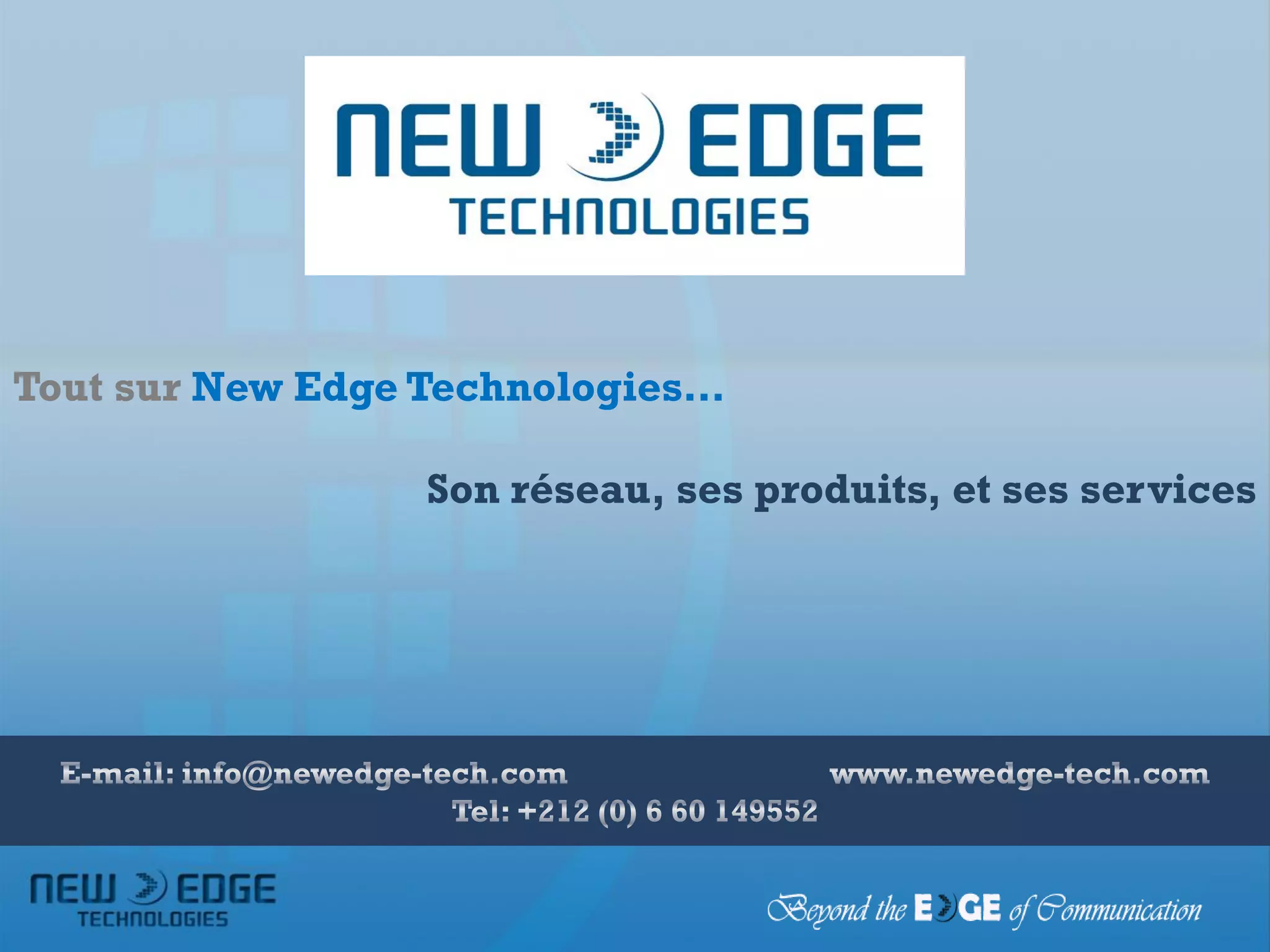 New Edge Technologies est spécialisée dans les solutions de communications unifiées, incluant la téléphonie, la vidéoconférence et la collaboration, avec des opérations au Maroc et à l'international. Leur offre comprend une solution hébergée pour Microsoft Lync, permettant une intégration de divers outils de communication, ainsi qu'une large gamme de produits de vidéoconférence. L'entreprise se distingue par son support technique, ses partenariats solides et sa capacité à offrir des solutions clé en main sans investissement préalable pour les clients.