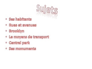 La ville de New York est composée de cinq arrondissements, avec une population de 8 491 079 habitants. Elle est connue pour ses quartiers ethniques comme Little Italy et Chinatown, ainsi que pour des symboles iconiques comme la Statue de la Liberté et l'Empire State Building. New York dispose de moyens de transport emblématiques, incluant les taxis jaunes et un réseau de métro étendu.