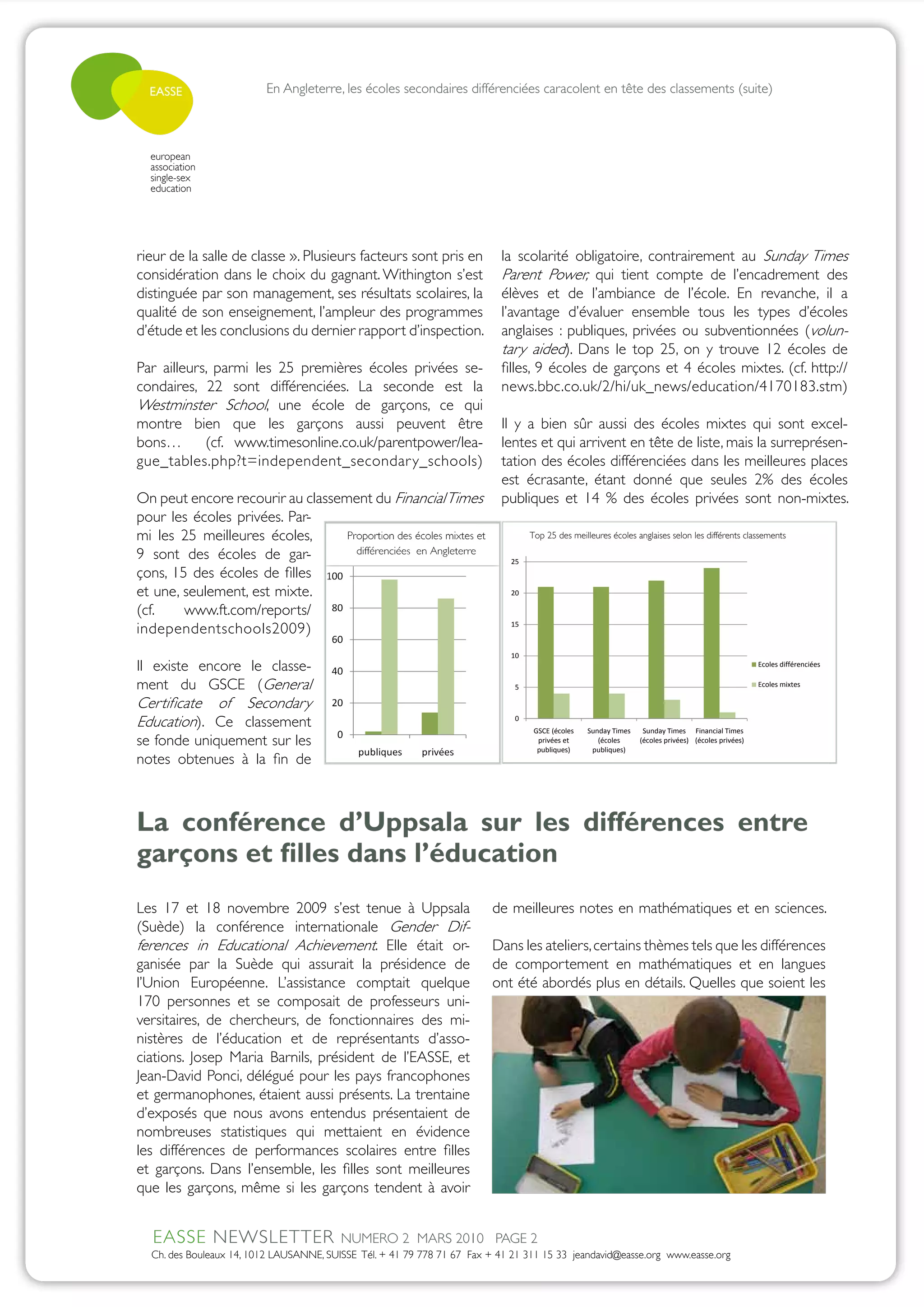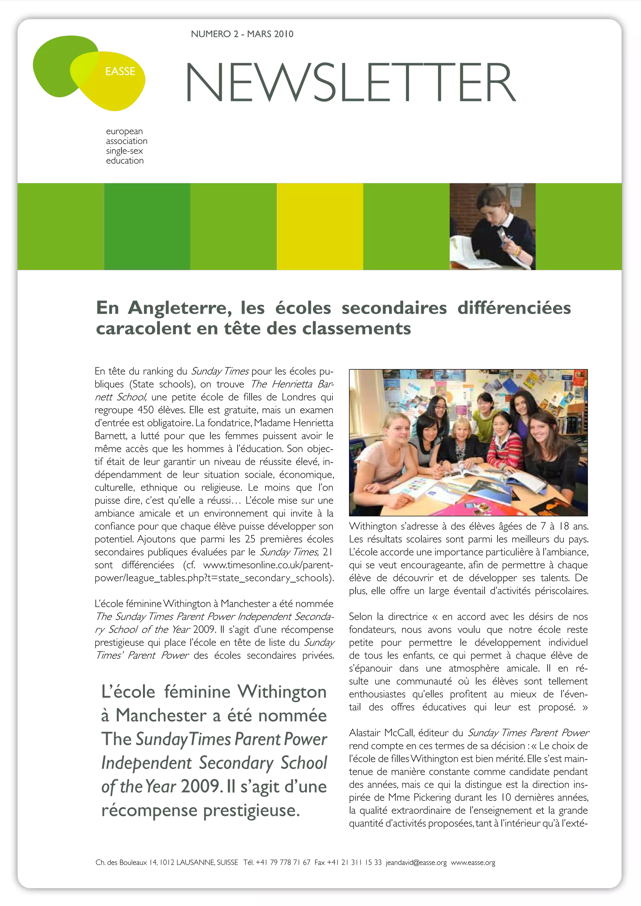 La newsletter d'EASSE de mars 2010 met en avant le succès des écoles secondaires différenciées en Angleterre, comme la Henrietta Barnett School et la Withington Girls' School, qui se distinguent par leurs résultats scolaires élevés et leur environnement encourageant. Un rapport souligne également les différences de performances scolaires entre filles et garçons, mettant en avant que les filles réussissent généralement mieux malgré que les garçons aient de meilleures notes en mathématiques et sciences. En outre, un livre de Jean-Louis Auduc aborde l'échec scolaire croissant des garçons, soulignant l'impact des stéréotypes de genre sur leur parcours éducatif.