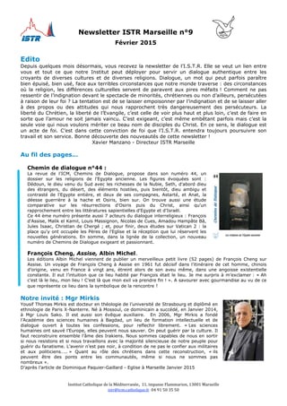 La newsletter de l'I.S.T.R. aborde le dialogue interreligieux dans un contexte de persécution et d'indignation face aux conflits contemporains, soulignant l'importance d'une approche fondée sur l'amour et la foi. Elle présente également des ressources sur les religions anciennes, les figures du dialogue interreligieux et des actualités liées à des formations sur l'éducation et la spiritualité. Ce numéro affirme l'engagement de l'institut pour un dialogue authentique entre croyants de diverses cultures et religions.