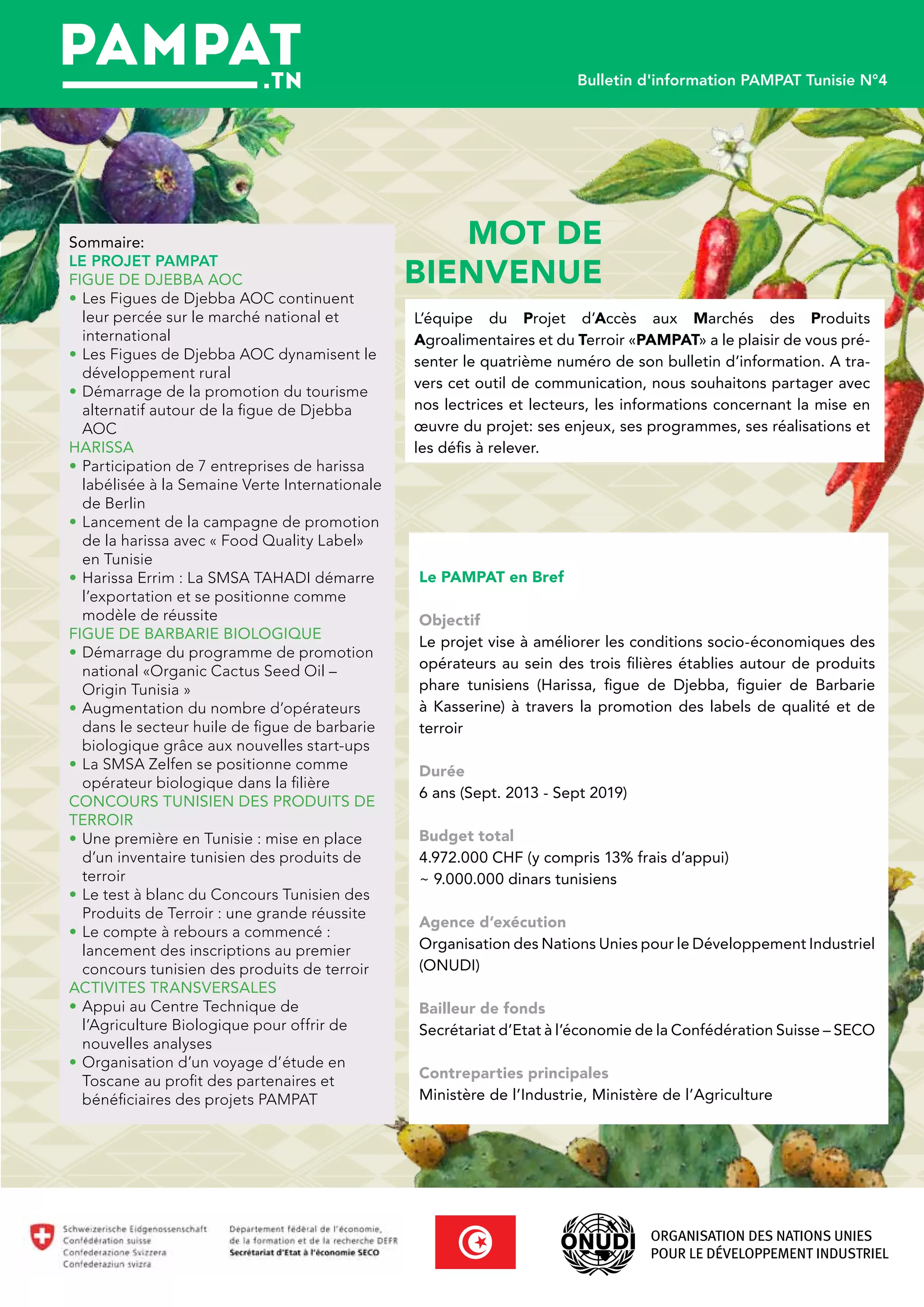 Le projet Pampat vise à améliorer les conditions socio-économiques des opérateurs de trois filières agroalimentaires en Tunisie en promouvant des produits locaux de qualité. Le bulletin présente des réalisations, notamment la valorisation de la figue de Djebba AOC, la promotion de la harissa labélisée et le développement de l'agriculture biologique. Diverses initiatives comme des concours, des festivals et des activités touristiques sont mises en avant pour dynamiser les filières et le développement rural.