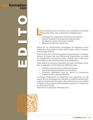 Nextformation est un acteur clé dans la formation professionnelle, proposant des programmes visant à développer les compétences des individus et des organisations à travers divers domaines tels que la communication, le management et l'informatique. Ils offrent une variété de formations, allant de la formation continue aux stages diplômants, tout en mettant l'accent sur l'importance de l'innovation et de la maîtrise des technologies. Leurs services incluent également des ateliers et des événements pour favoriser le partage d'expertises et maximiser l'efficacité professionnelle.