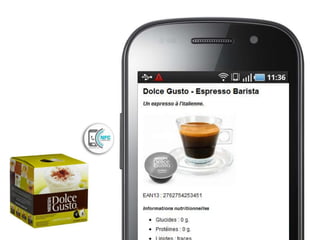 Le document traite de la technologie NFC (Near Field Communication), qui permet des échanges de données sans contact sur de courtes distances et est intégrée dans des smartphones, avec des prévisions d'adoption croissante en 2013. Les applications de NFC sont variées, allant du paiement sans contact à des solutions dans le marketing, la traçabilité, et le tourisme, avec un potentiel encore à explorer. Cette technologie favorise une architecture légère et agile, intégrant un lien entre les smartphones et le web.