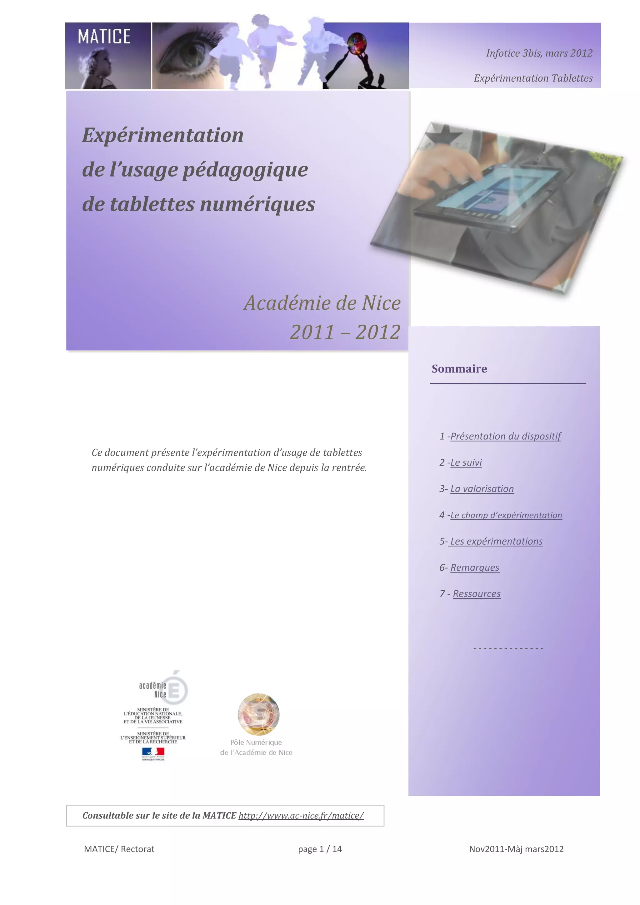 Le document présente une expérimentation menée dans l'académie de Nice sur l'utilisation pédagogique des tablettes numériques entre 2011 et 2012, visant à évaluer leur impact sur l'apprentissage et l'accès aux ressources. Divers établissements sont impliqués, avec un suivi organisé par un comité et des évaluations des compétences des élèves. Des projets variés sont développés en fonction des besoins spécifiques des élèves, y compris ceux en situation de handicap.