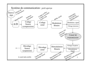 Le document traite du canal radio-mobile, abordant des concepts tels que la modulation, le codage, et les modèles de propagation à long, moyen et court termes. Il décrit également les effets d'évanouissement, les caractéristiques du canal et la modélisation statistique des multipath. Les différentes méthodes de traitement du signal pour optimiser la transmission dans des environnements variés sont également abordées.
