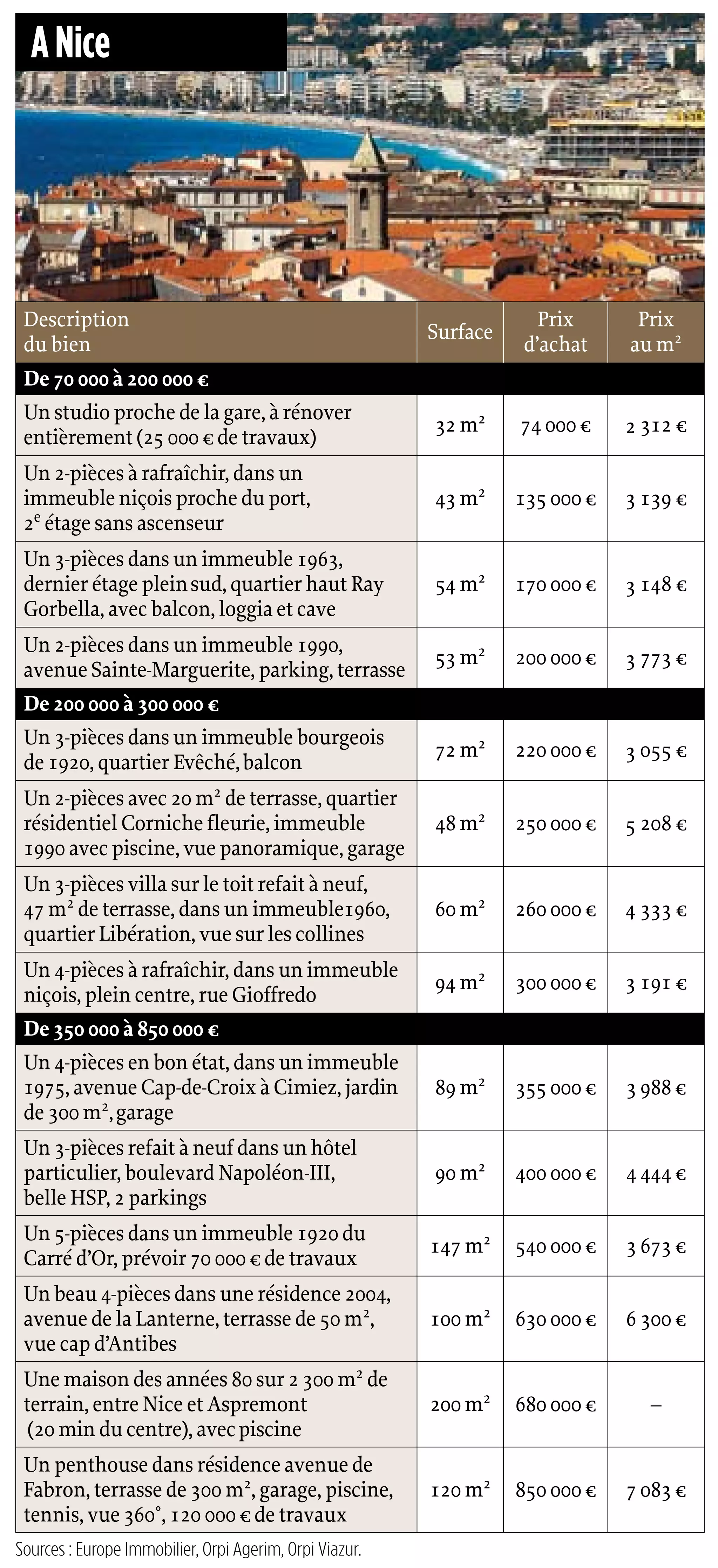 Le marché immobilier de Rennes a connu une augmentation des ventes de 25% depuis janvier 2010, portée par une hausse prévisionnelle de la population de 24% d'ici 2030. À Nice, la baisse des taux de crédit immobilier compense la hausse des prix, avec des quartiers en reprise rapide après la crise. Divers biens immobiliers sont listés, avec des prix au mètre carré variant considérablement selon les quartiers et les caractéristiques des propriétés.