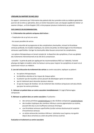 Ce document présente les recommandations de la NICE pour le diagnostic et la gestion des varices des membres inférieurs, visant à améliorer les soins et réduire les disparités au Royaume-Uni. Les étapes incluent l'identification appropriée des patients, l'éducation sur les traitements et la gestion des complications potentielles. Les recommandations sont basées sur des preuves cliniques, insistant sur l'importance de l'information des patients et de l'évaluation continue des traitements interventionnels.