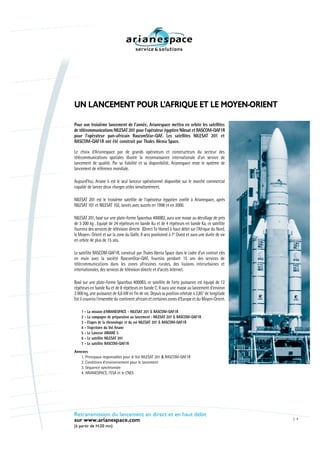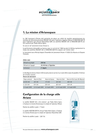 Arianespace prévoit de lancer les satellites Nilesat 201 et Rascom-Qaf1R pour les opérateurs Nilesat et Rascomstar-QAF respectivement, lors de son troisième lancement de l'année. Nilesat 201, pesant près de 3 200 kg, fournira des services de télévision directe en Afrique du Nord et au Moyen-Orient, tandis que Rascom-Qaf1R, d'environ 3 000 kg, soutiendra les communications dans les zones rurales africaines. Ce lancement, prévu pour le 4-5 août 2010, met en avant la fiabilité d'Arianespace comme fournisseur de lancement mondial.