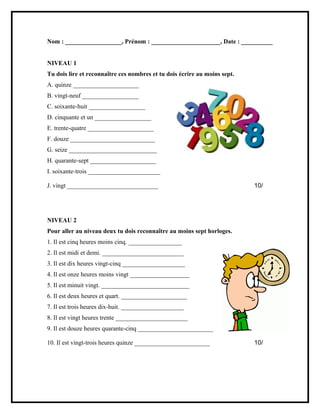 Le document est un exercice d'apprentissage structuré par niveaux. Au niveau 1, les participants doivent lire et écrire des nombres. Au niveau 2, l'exercice porte sur la reconnaissance de différentes heures indiquées sur des horloges.