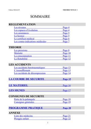 Le document présente la théorie de la plongée sous-marine niveau 1, incluant la réglementation, les niveaux de plongée et les espaces d'évolution, ainsi que les exigences de sécurité comme le certificat médical et l'assurance. Il explique les principes de pression, la flottabilité et les accidents de plongée, tout en fournissant des consignes de sécurité. Les informations sont destinées aux débutants à la recherche d'une formation en plongée, avec des détails sur les pratiques recommandées et les risques associés.
