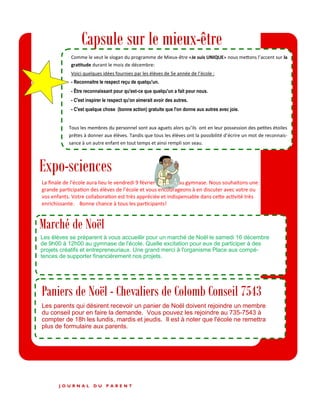 Le document concerne les activités de fin d'année à l'école Notre-Dame, incluant une soirée familiale, une collecte de denrées non-périssables, et un marché de Noël. Les élèves participent à divers événements comme un spectacle de Noël et un repas festif, tout en mettant l'accent sur la gratitude. La communication inclut également des informations pratiques pour les parents, telles que les réservations de repas et d'autres activités scolaires.