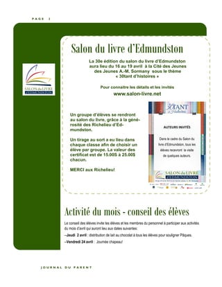 Le document annonce la Journée de la Terre qui se tiendra le 22 avril, encourageant la communauté à participer en portant des vêtements bleus ou verts et à agir pour la protection de l'environnement. Il présente également diverses activités scolaires et communautaires prévues en avril, telles qu'un salon du livre et des concours. Enfin, il fournit des informations sur l'importance de la nutrition et des conseils pour trouver des sources fiables d'informations en santé sur Internet.