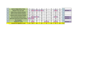 Le document présente les résultats académiques d'élèves dans différentes matières avec des notes allant de 0 à 7. Certains élèves ont des notes en attente qui nécessitent une attention particulière. En moyenne, les notes par matière sont globalement satisfaisantes.