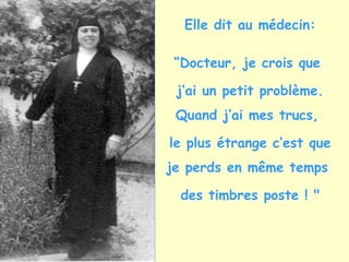 Une nonne consulte un gynécologue pour un problème de santé, affirmant qu'elle perd des timbres poste pendant ses règles. Le médecin, surpris, réalise rapidement qu'il s'agit en fait d'étiquettes adhésives de bananes. Cette situation comique souligne une méprise inattendue.