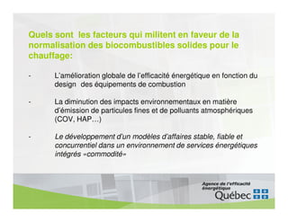 La normalisation des biocombustibles solides est essentielle pour améliorer l'efficacité énergétique et réduire les émissions de polluants dans le chauffage à la biomasse. Elle repose sur des caractéristiques normatives telles que la granulométrie, le taux d'humidité et le taux de cendre, qui affectent le rendement thermique et les rejets atmosphériques. Une approche formelle de normalisation est cruciale pour assurer la viabilité de la filière au Québec.