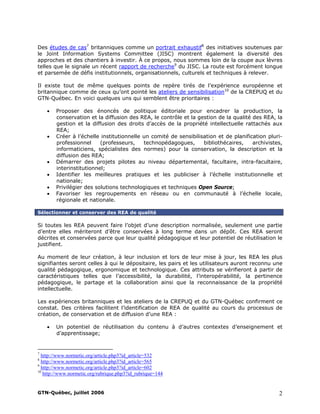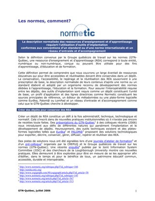 Le document traite des normes et des standards nécessaires à la description normalisée des ressources d'enseignement et d'apprentissage (REA) pour garantir leur conservation, accessibilité et interopérabilité. Il souligne les défis techniques et organisationnels liés à la création de dépôts pour les REA et propose des recommandations pour leur description et gestion efficace. Le groupe québécois de travail sur les normes (gtn-québec) vise à promouvoir l'accès et la réutilisation des REA au sein des institutions d'enseignement à travers l'appropriation de normes telles que normetic.
