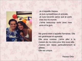 Le document présente une série de témoignages d'enfants sur leurs caractéristiques personnelles et leur relation avec leurs grand-mères. Chaque enfant décrit son caractère, ses hobbies et ses sentiments envers sa grand-mère, mettant en avant leur affection et admiration pour elles. Ces récits révèlent également les compétences culinaires et les traits de personnalité chaleureux des grand-mères, soulignant l'importance des liens familiaux.