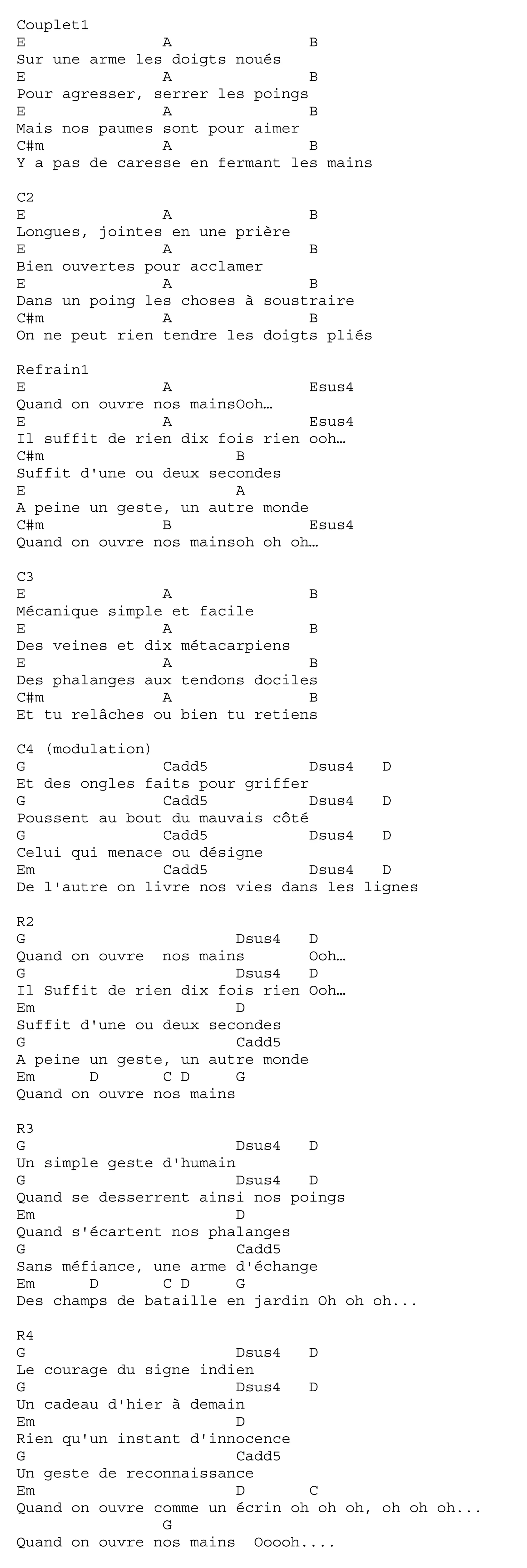 La chanson évoque la puissance d'un simple geste des mains, symbolisant l'amour et l'échange plutôt que l'agression. Elle souligne que par un geste minime, on peut transformer la réalité en un lieu de paix et de compréhension. Le refrain insiste sur l'importance de l'ouverture des mains pour créer un autre monde.