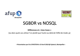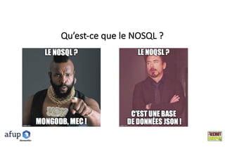 Le document présente les différences entre SGBDR et NoSQL, en détaillant les types de bases NoSQL (clés/valeurs, colonnes, documents, graphes) et leurs cas d'utilisation respectifs. Il met en avant les avantages des bases NoSQL, telles que la flexibilité et la rapidité, tout en soulignant leurs inconvénients, notamment le manque de structure et de contrôle sur l'intégrité des données. En conclusion, bien que NoSQL offre plus de souplesse et de rapidité, il impose des précautions supplémentaires pour maintenir la cohérence et l'intégrité des données.